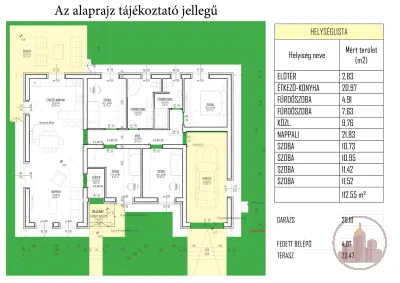 Előtér 2,83 m2, Étkező-Konyha 20,97 m2, Fürdőszoba 4,91 m2, Fürdőszoba 7,63 m2, Közlekedő 9,76 m2, Nappali 21,83 m2, Szoba 10,73 m, Szoba 10,95 m2, Szoba 11,42 m2, Szoba 11,52 m2