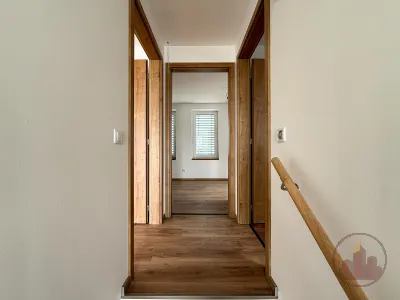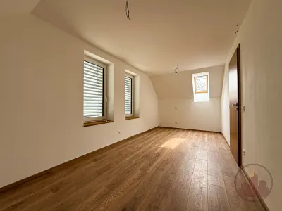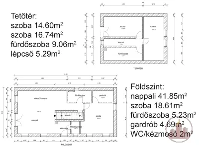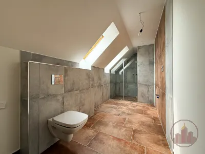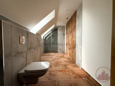 Az emeleten két további hálószoba (14,60 m² és 16,74 m²) várja a család tagjait, mindkettő kényelmes méretű, jól szellőztethető, VELUX tetőablakokkal kiegészítve. A 9,06 m²-es fürdőszoba modern, ipari stílusú burkolattal, üveg zuhanyfülkével és tetőablakokkal lett kialakítva - a szintet teljesen önállóan használhatóvá teszi.