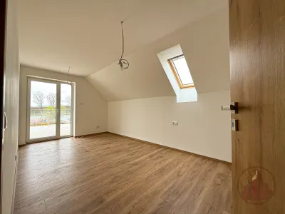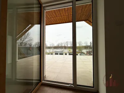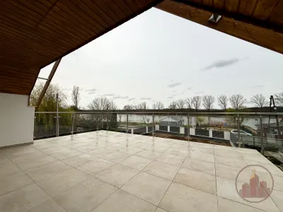 Az emelet igazi koronája a tágas terasz, amelyről lélegzetelállító panoráma nyílik a közeli tóra és a környező zöld területekre. Az üveg-rozsdamentes acél korlát szabad kilátást biztosít, a természetes fa mennyezet meleg hangulatot teremt, a nagy formátumú járólap pedig az igényes kivitelezés természetes folytatása. Ez a terasz nem csupán kiegészítő - ez a ház egyik legértékesebb tere, ahol reggeli kávétól az esti napnyugtáig élmény kint lenni. A padlástér OSB burkolattal ellátott, tárolásra alkalmas.