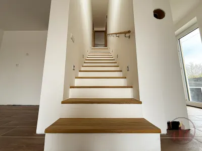 A két szintet egy elegáns, tölgyfa járólapokkal burkolt lépcső köti össze, beépített LED lépcsővilágítással.